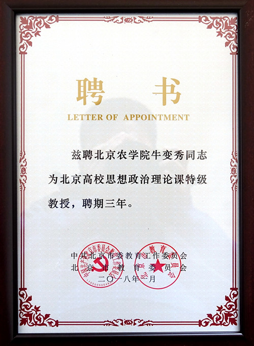 日前,北京市教工委发布第二批北京高校思想政治理论课特级教授聘书,williamhill英国牛变秀教授获聘北京高校思想政治理论课特级教授,聘期三年。