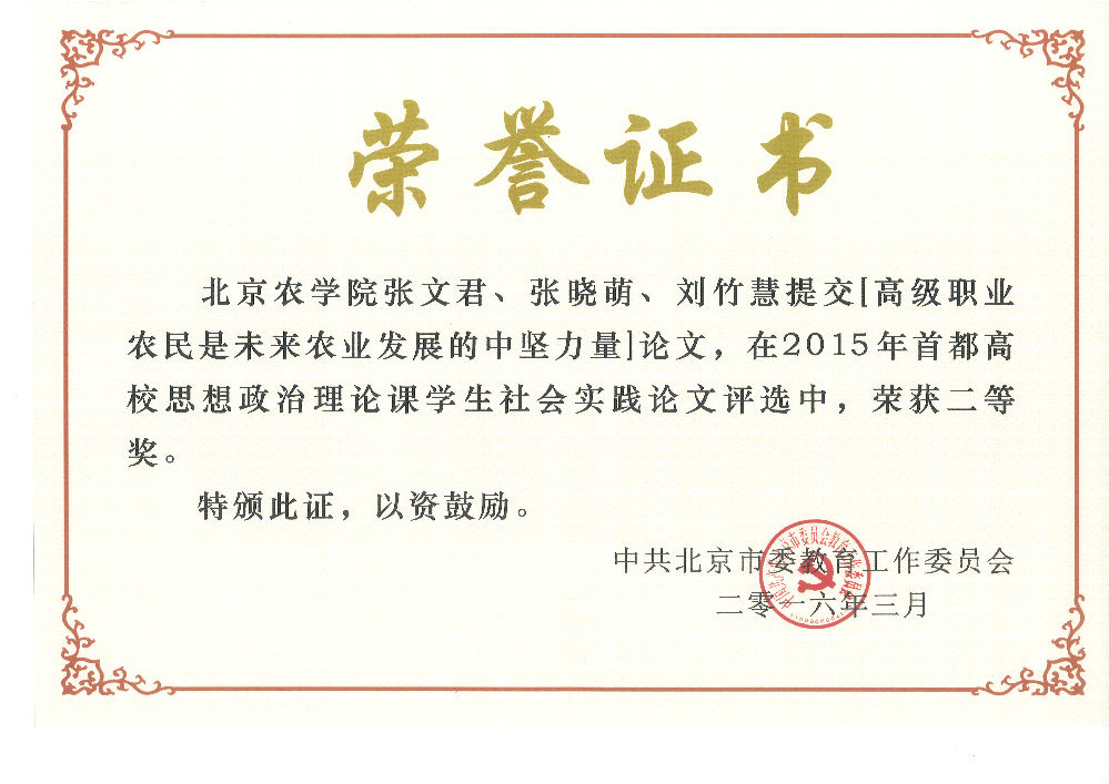 日前,中共北京市委教育工委下发了《关于表彰2015年北京高校思想政治理论课学生社会实践优秀论文、指导教师和组织奖的通知 》,本次活动共收到来自全市37所高校提交的166篇学生社会实践论文。经专家评审,我校思政部推荐的论文《高级职业农民是未来农业发展的中坚力量》(作者:张文君、张晓萌、刘竹慧)获得二等奖,这是我校思政课学生社会实践论文连续第五年获得荣誉。