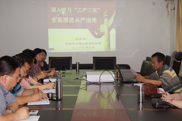 按照学校党委的统一部署要求,2015年6月25日下午,思政部直属党支部书记孙亚利为全体党员教师做了“三严三实”主题教育党课。
