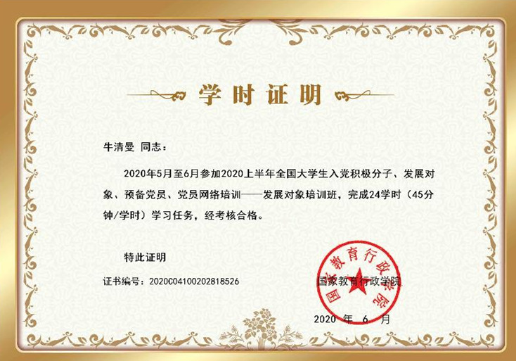 参训学员围绕“厚植爱国主义情怀 争做新时代学生楷模”这一主题撰写了800 字的思想汇报。学员卞思宇写到:“作为一名入党积极分子,我更应该争做新时代的学生楷模,在日常的生活学习中给其他同学做出表率,努力学习专业技能,为建设祖国做好知识储备。”学员王晨航写到:“作为新时代的学生,我要积极听从党的领导,认真贯彻党的精神,向优秀的党员前辈们学习,努力争取做未来学生群众的学习榜样与楷模。我一定坚定沿着党的指导路线前进,不忘初心、牢记使命、不懈奋斗,并延续中国共产党员的优秀精神,尽快成为一名合格的中国共产党员。”学员覃佳琳写到:“在今后的学习中,我将以这次党课学习为契机,不断加强自己的政治理论学习,提高自己的政治觉悟、思想水平,努力钻研专业知识,尽自己所能帮助身边的人,同时以集体利益为重,以人民利益为重。肩负起自己的责任与义务,成为更加优秀的自己,并勇于积极自觉地接受党的教育和考察。”在最后的考试环节,参训学员通过45分钟的在线测试,对学习成果进行验收验证,并顺利拿到了学校党委党校颁发的结业证书,圆满完成了此次教育培训任务。