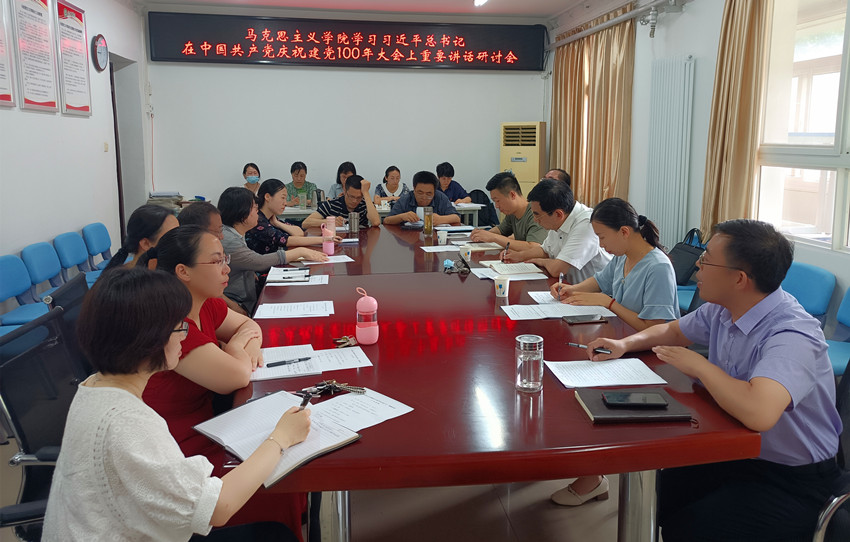 在研讨过程中,学院直属党支部书记高建伟、院长华玉武首先和大家报告了学习体会和深刻感悟,并对学深悟透讲话精神、及时融入思政课教学以及发挥思政课教师自身优势、加强宣讲宣传和研究等方面提出建议。随后与会思政课教师党员逐一发言谈体会、谈认识。大家一致认为,习近平总书记在庆祝中国共产党成立100周年大会上的重要讲话是一篇马克思主义纲领性文件,处处闪烁着马克思主义理论的光辉,是党团结带领人民以史为鉴、开创未来的行动指南;大家认为,习近平总书记用“四个伟大成就”、“九个必须”深刻阐述了中国共产党的奋斗历程和宝贵经验,有力回答了马克思主义为什么行、中国共产党为什么能、中国特色社会主义为什么好这一根本问题;大家认为建党精神是中国共产党的精神之母,体现了中国共产党历史发展的主题和主线,展示了中国共产党历史的主流和本质,具有传承、支撑和密码的价值作用;老师们表示,要把学习习近平总书记在庆祝中国共产党成立100周年大会上的重要讲话,同学习习近平新时代中国特色社会主义思想、同学习习近平总书记关于党史学习教育的重要论述有机结合起来,深刻理解其思想精髓和核心要义,及时融入思政课程,认真开展宣传宣讲和专题研究,在真学、真悟、真信上下功夫、见成效,教育引领北农学子增强“四个意识”、坚定“四个自信”、做到“两个维护”。