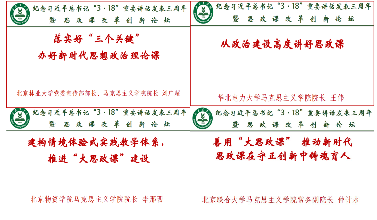 北京北京林业大学党委宣传部长、马院院长刘广超作了《落实好“三个关键”,办好新时代思政课》专题报告,介绍了高校在加强对思政课改革创新的组织领导、打造高水平教师队伍、提高思政课“三性一力”方面的经验和做法。华北电力大学马院院长王伟作了《从政治建设高度讲好思政课》的专题报告,从对“政治”的学理阐释以及维护意识形态安全的角度,阐述了总书记重要讲话的深刻内涵和思政课建设的重要性。北京物资学院马院院长李邢西作了《建构情境体验式实践教学体系,推进“大思政课”建设》的专题报告,介绍了该校从问题导向出发构建“情境体验式实践教学体系”,打造“大思政课”格局的经验和成效。北京联合大学马院常务副院长仲计水作了《善用“大思政课” 推动新时代思政课在守正创新中铸魂育人》的专题报告,从组织师生走出去、红色教育资源引进来、教育教学改革深下来三个方面,介绍了该校打造具有红色基因、北京味道、联大特色的大思政课的做法和成效。