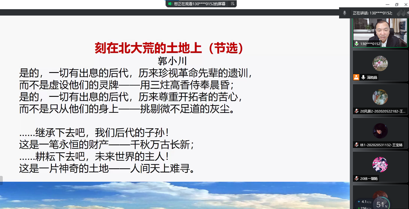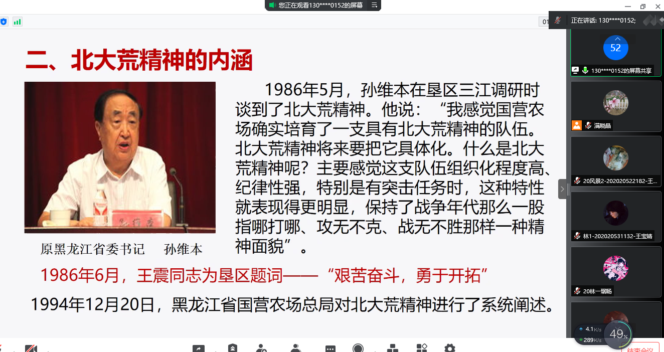 5月11日晚,学校党委副书记仲丛生为园林学院2020级风景园林专业和林学专业的本科生,讲授了题为“北大荒精神及其时代价值”的形势与政策课。