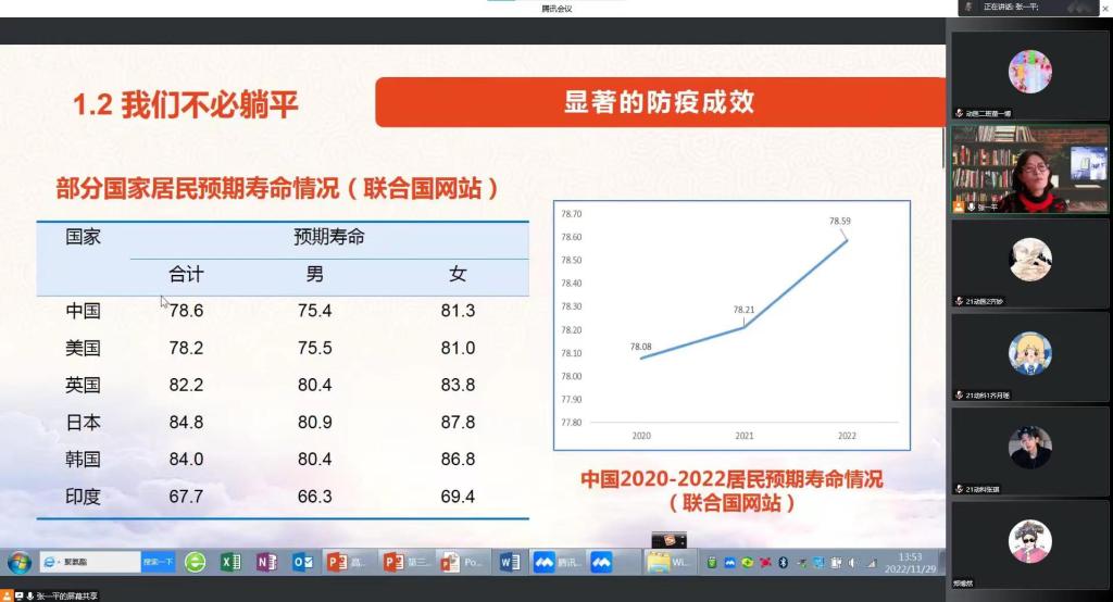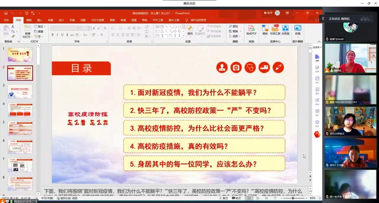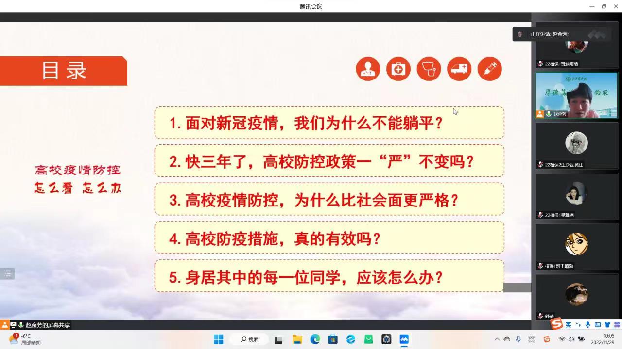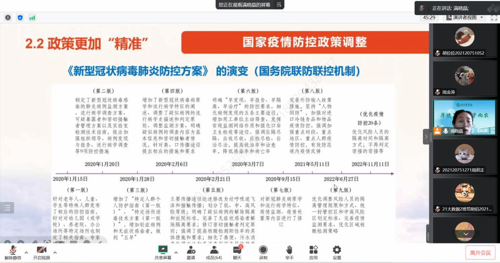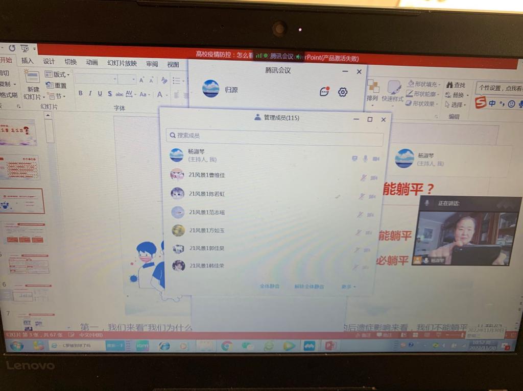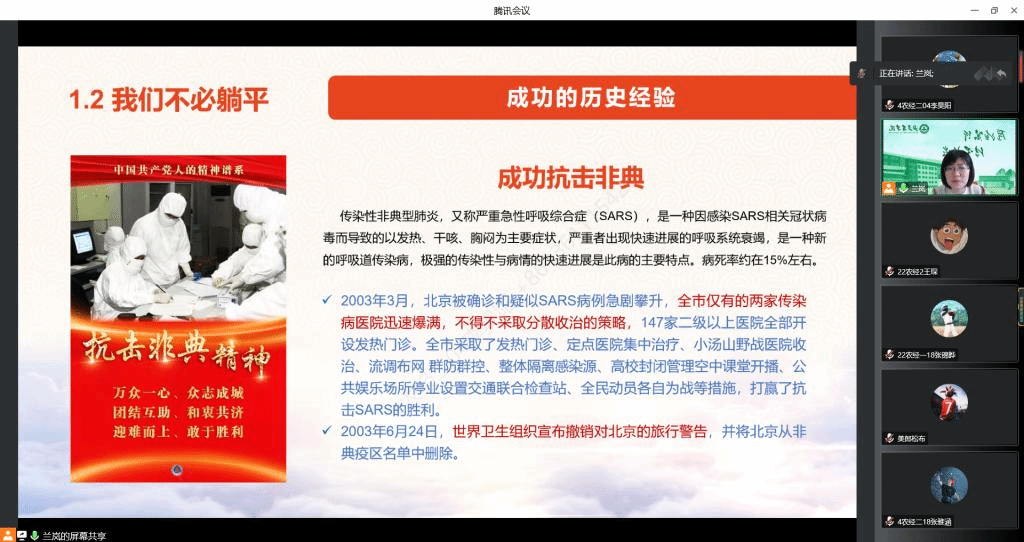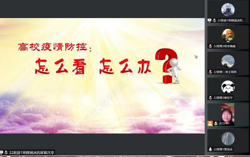 学生们纷纷表示,这堂疫情防控“大思政课”是一场及时雨,解答了长期困扰大家的一些思想困惑,使广大同学更加坚定了听党话、跟党走的信心。2021级魏雨泽同学表示,老师给我们上了一堂疫情防控课,令我受益匪浅,刻骨铭心。我对中国在疫情中的担当感到骄傲自豪,对新型冠状病毒有进一步的了解和认识,学习并掌握了预防措施;张乐妍同学表示,我们要做好防护配合防疫政策,不信谣,不传谣,有自己的独立思考,认真做好每天的健康上报与核酸检测,做好自己与家人的思想工作,也向家人们解释为什么中国不躺平,传播正能量。2022级高源同学表示,对于我们大学生来讲,要积极配合学校的各项疫情防控政策。每个人都会有属于自己的责任。懂得承担责任,是一个优秀大学生的必备品格;戴庆睿同学表示,我们要把这次疫情当作是一种学习和成长的机会,积极参与,积极奉献,做好自己的人生规划,树立正确的世界观、人生观和价值观。