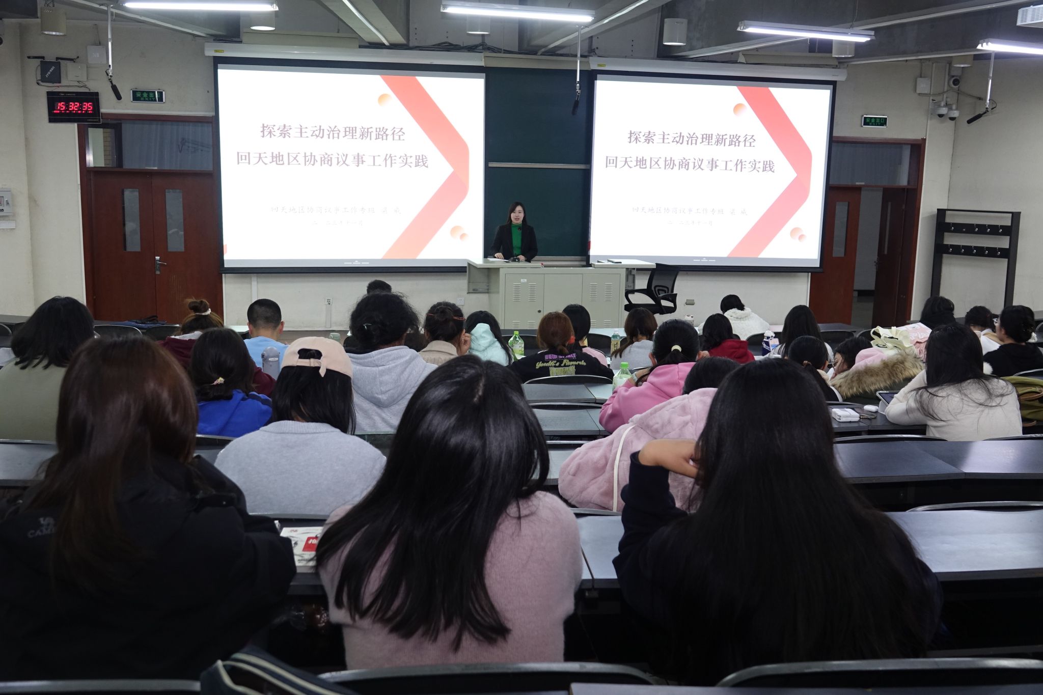 11月14日,回天地区协商议事工作专班干部梁威以“探索主动治理新路径----回天地区协商议事工作实践”为主题,给同学们讲述了回天地区以社区(村)为重点,搭建“回天有约”基层协商议事平台体系,突出党建引领、主动治理,搭建楼门院-社区(村)-镇街-回天地区四级协商议事体系建设试点工作,增强各民族群众主人翁意识,培育“有事好商量”的协商议事习惯,画出家园建设最大“同心圆”;她通过详实的案例和大量的数据,从六个方面介绍了基层协商议事工作做法、“十个一”实践成果,实现了群众意见求同存异、议事各方适当妥协的议事效果,成为基层协商民主的典范。