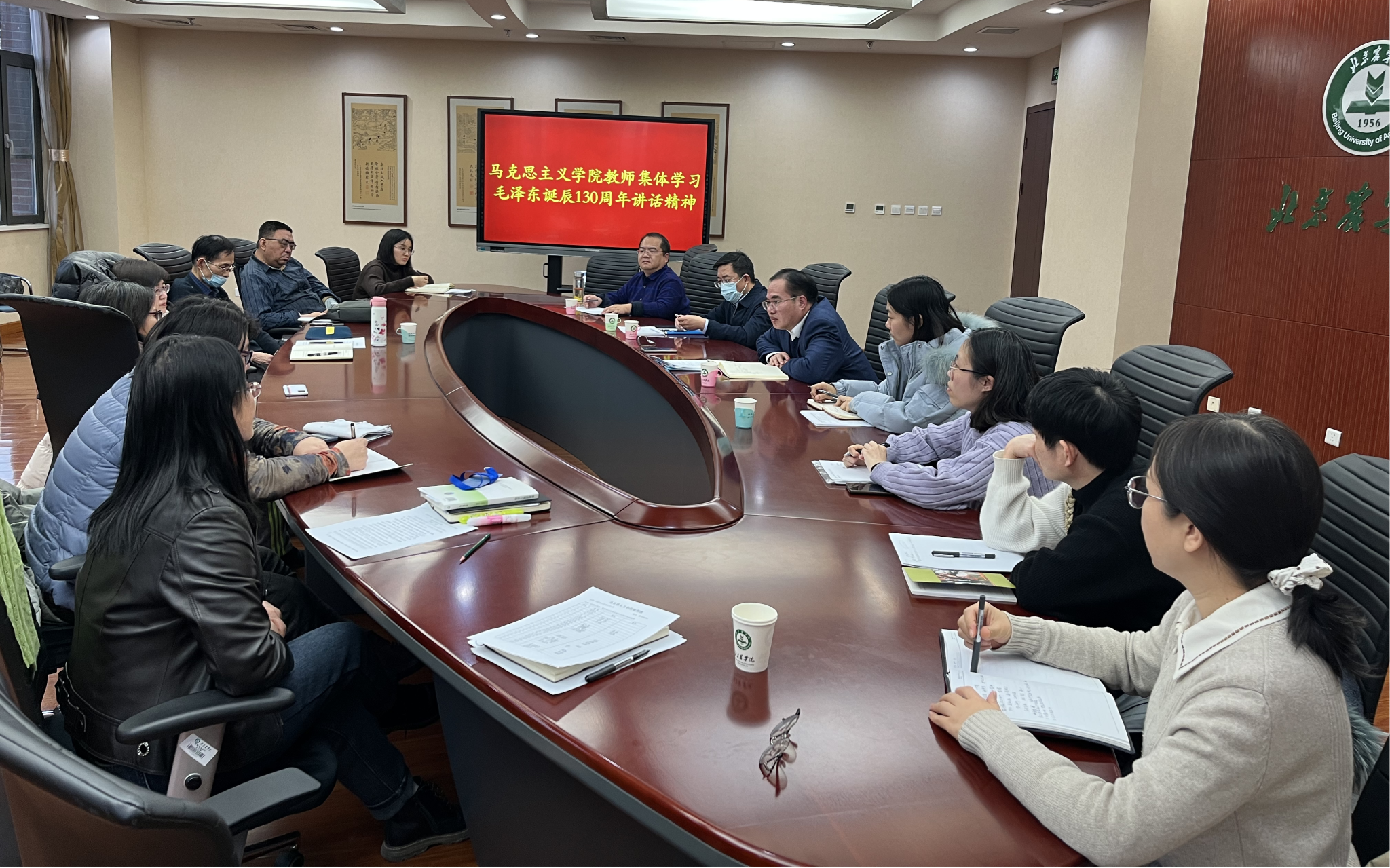 12月28日下午,williamhill英国思政课教师集体学习研讨习近平总书记在纪念毛泽东同志诞辰130周年座谈会上的重要讲话精神。会议由院长华玉武主持。