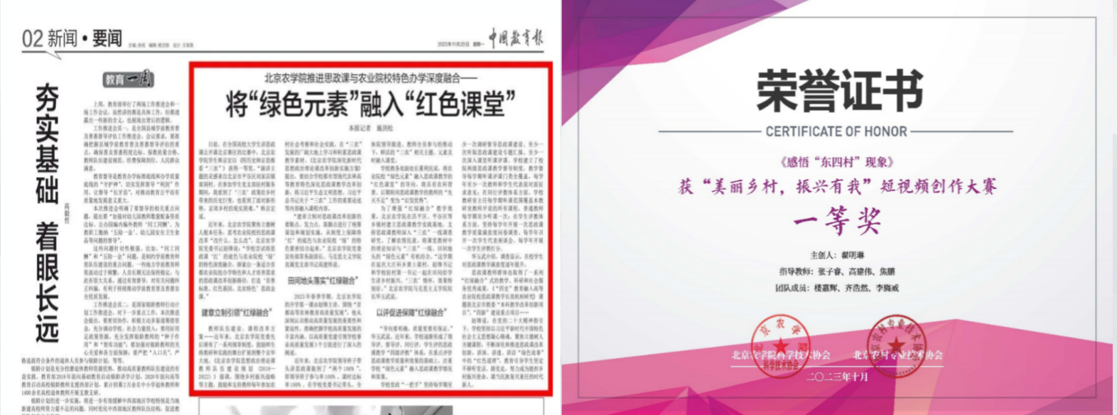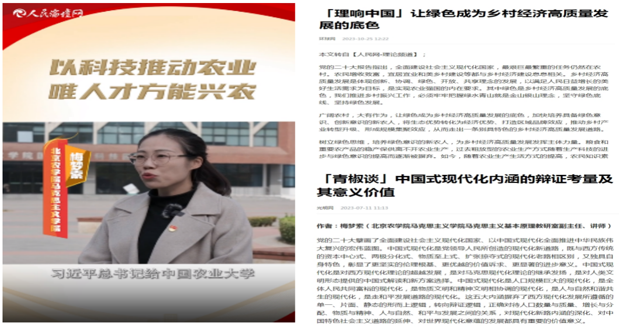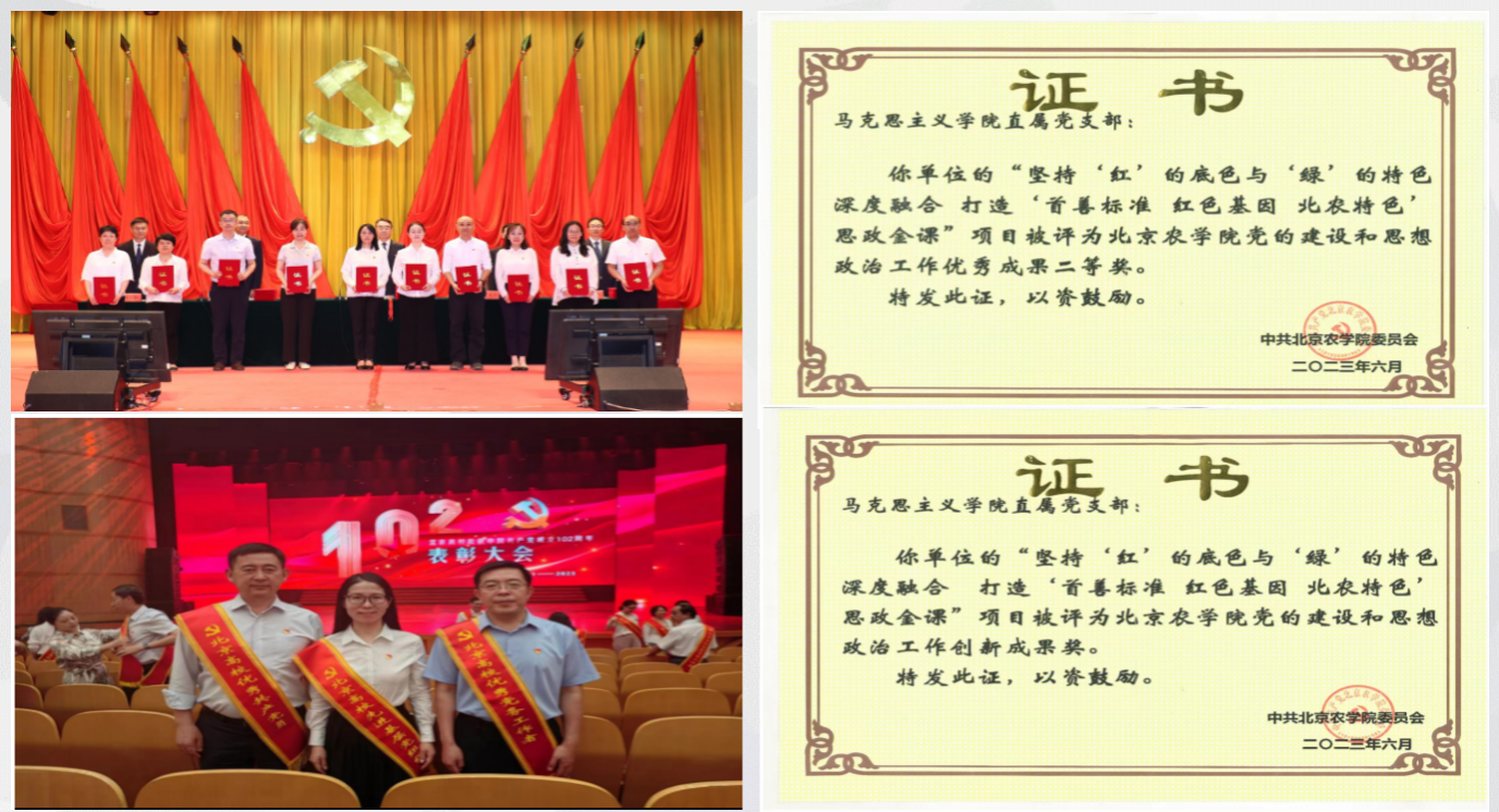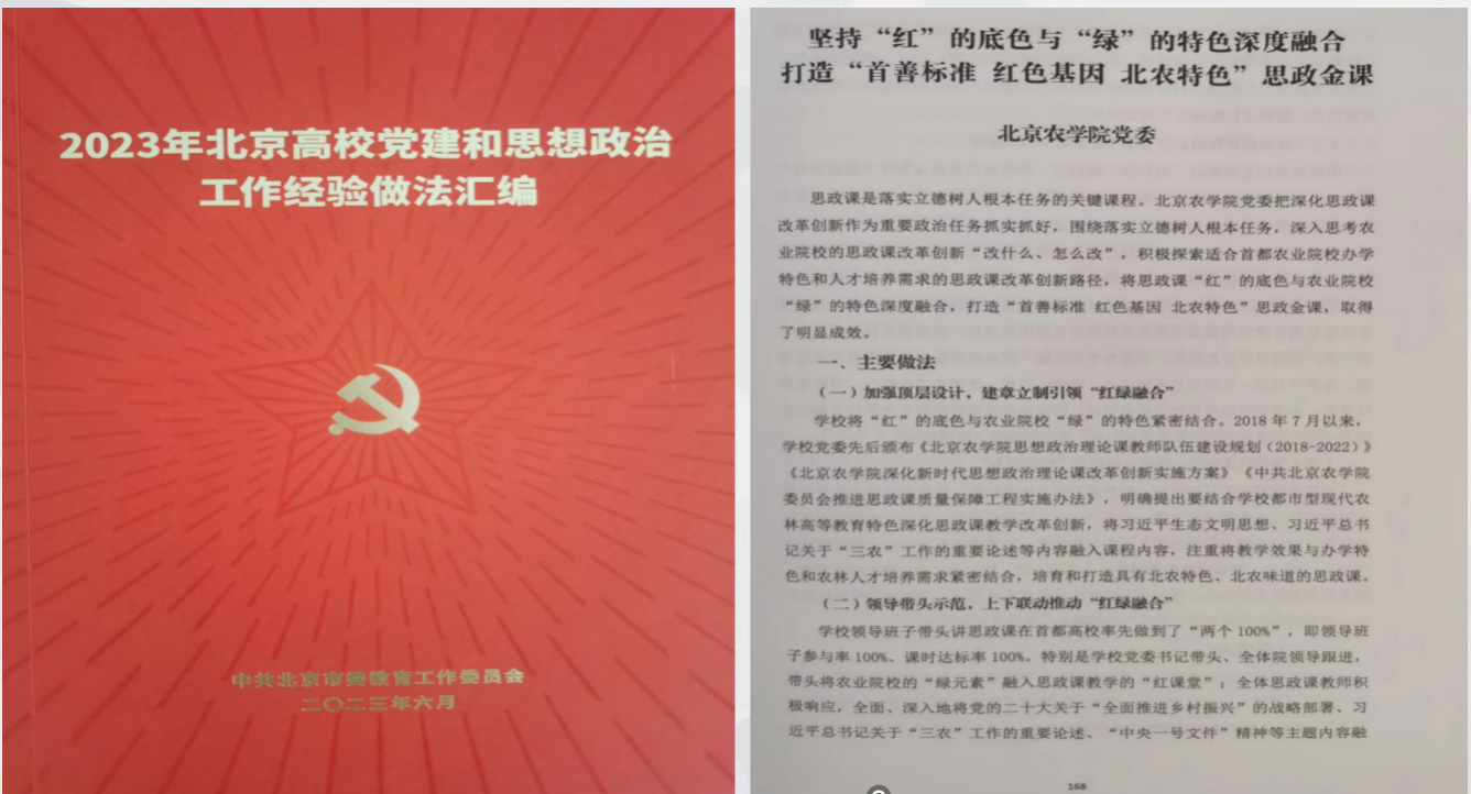落实中央和市委要求,校领导带头讲思政课、听思政课;持续推动思政课“红色基因”与学校“绿色元素”深度融合,增强“北农味道”。深入推进思政课大中小一体化建设,及时将社会热点、焦点融入思政课堂,增强感染力、时代性。思政课教师在学校教学创新大赛中荣获第一名一等奖。思政课教师申报的《从“心”出发,把思政课打造成为“实证”课》案例荣获北京市大中小幼讲述育人故事二等奖,《依托自媒体开展思想课教学》在全国农林院校思政课教学年会论文评比中荣获一等奖。《打造“红色基因、首善标准、北农特色”思政金课》获批北京高校党建思政培育项目,被推荐参评北京高校思政课改革创新优秀案例。