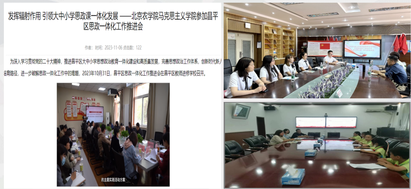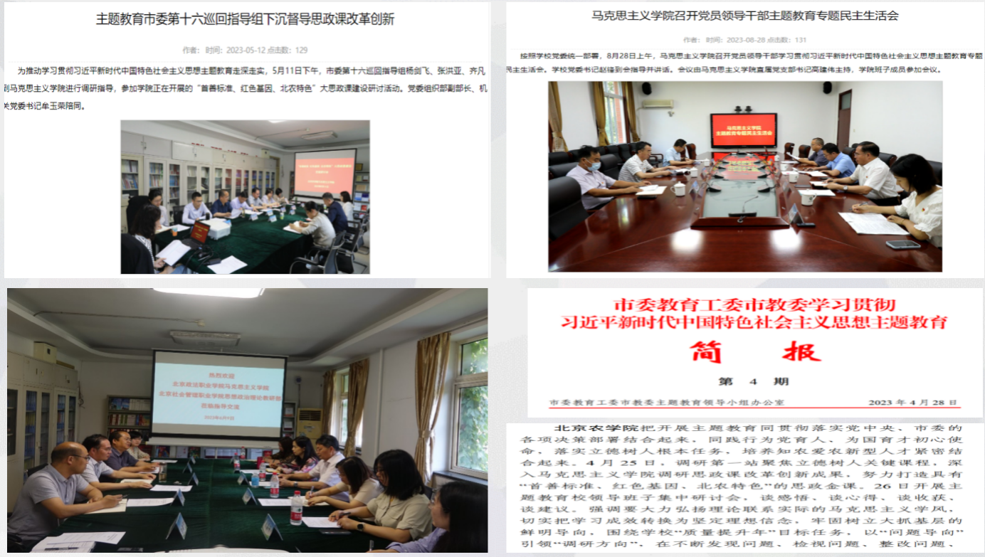 通过周末理论讲堂、同备一堂课等,校领导与思政课教师集体学习备课,深入学习党的创新理论。思政课教师深入党校培训班、青马班、尚农讲堂、二级学院等宣讲二十大精神,深入推进党的创新理论三进。依托学校特色,思政课教师与专业课教师同上《习近平新时代中国特色社会主义思想在京华大地生动实践》课程。认真学习贯彻第四次党代会精神,及时将党代会精神融入课程、讲给学生。积极开展党的创新理论研究阐释,思政课教师在《人民网》《光明网》《经济日报》发表文章,编写出版文化研究、乡村振兴、行走课堂等相关著作。扎实开展主题教育,在党委坚强领导下,解决了集中办公、智慧教室、师资补充等急难愁盼问题,调动了思政课教师积极性。