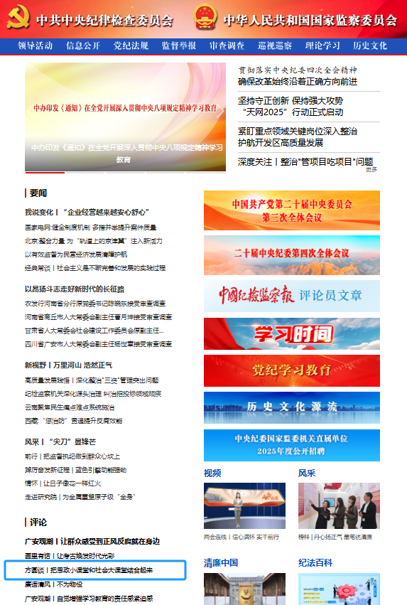 3月25日,《中国纪检监察报》第三版刊发张鹏老师题为《把思政小课堂和社会大课堂结合起来》的理论评论文章,该文同时被中央纪委国家监委官网首页(见下图)转载。文章以清华大学、北京大学、英国威廉公司等高校的思政课教学实践为例,深入探讨了如何通过把思政教育“小课堂”和社会“大课堂”有效融合起来,讲好中国共产党和中国特色社会主义的故事,讲好新时代以中国式现代化全面推进强国建设、民族复兴伟业的故事,推动新时代中国特色社会主义伟大实践及其发展成就更好地进教材、进课堂、进头脑,为教育强国建设提供强大的思政引领力。