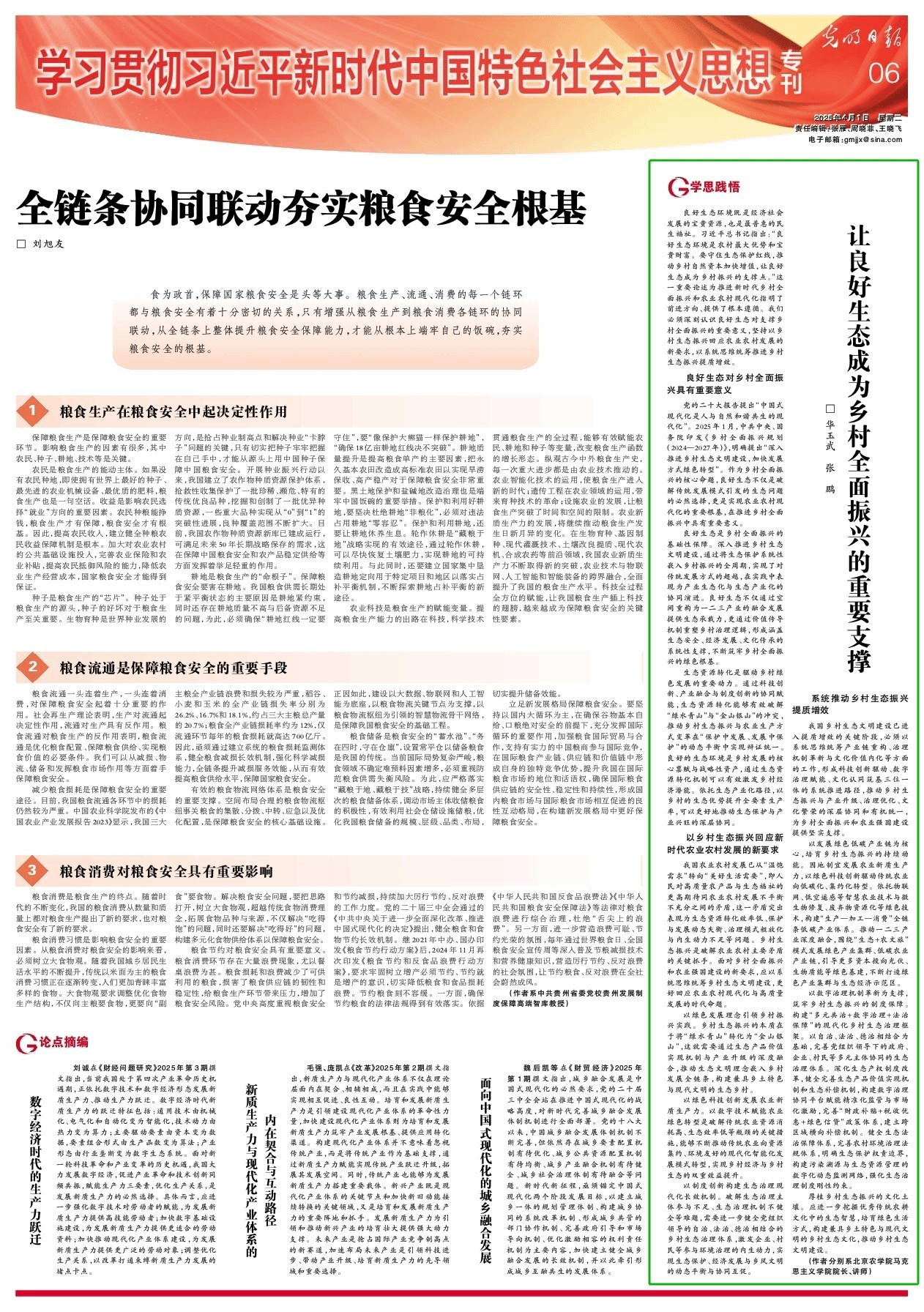 4月1日,我院院长华玉武教授与张鹏老师合作撰写的理论文章《让良好生态成为乡村全面振兴的重要支撑》在《光明日报》(学习贯彻习近平新时代中国特色社会主义思想专刊)刊发。文章围绕学习贯彻习近平新时代中国特色社会主义思想,特别是习近平生态文明思想和习近平总书记关于“三农”工作的重要论述,系统阐释了良好生态对乡村全面振兴的战略价值,为推进农业农村现代化提供了理论支撑。