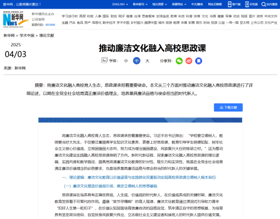 近日,我院思政课青年教师张鹏撰写的理论文章《推动廉洁文化融入高校思政课》在新华网“学术中国”栏目刊发。文章深入学习贯彻习近平总书记对思政课建设的重要讲话和重要指示精神,聚焦新时代高校廉洁文化建设与思政课改革创新,深入探讨廉洁文化教育融入思政课的理论逻辑与实践路径,引发广泛关注。此篇文章在新华网的刊发,既彰显了我院在思政课改革创新领域的积极探索,也为新时代高校廉洁文化建设提供了有益参考。