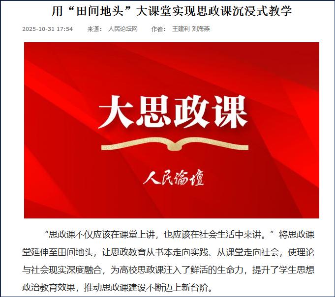 文章强调将思政课堂延伸至田间地头,让思政教育从书本走向实践、从课堂走向社会,使理论与社会现实深度融合,为高校思政课注入了鲜活的生命力,提升了学生思想政治教育效果,推动思政课建设不断迈上新台阶。