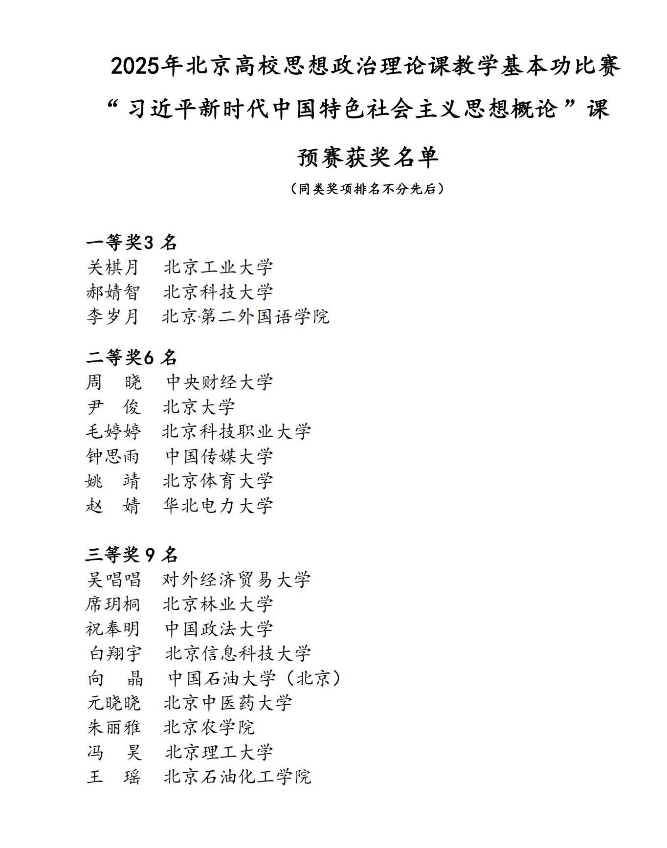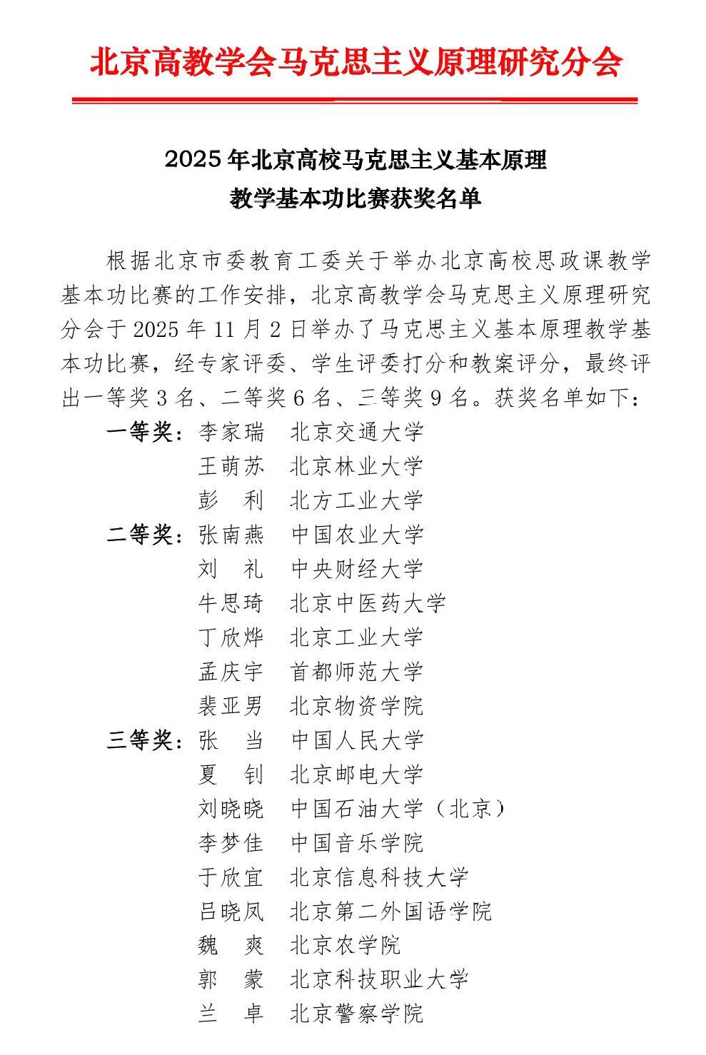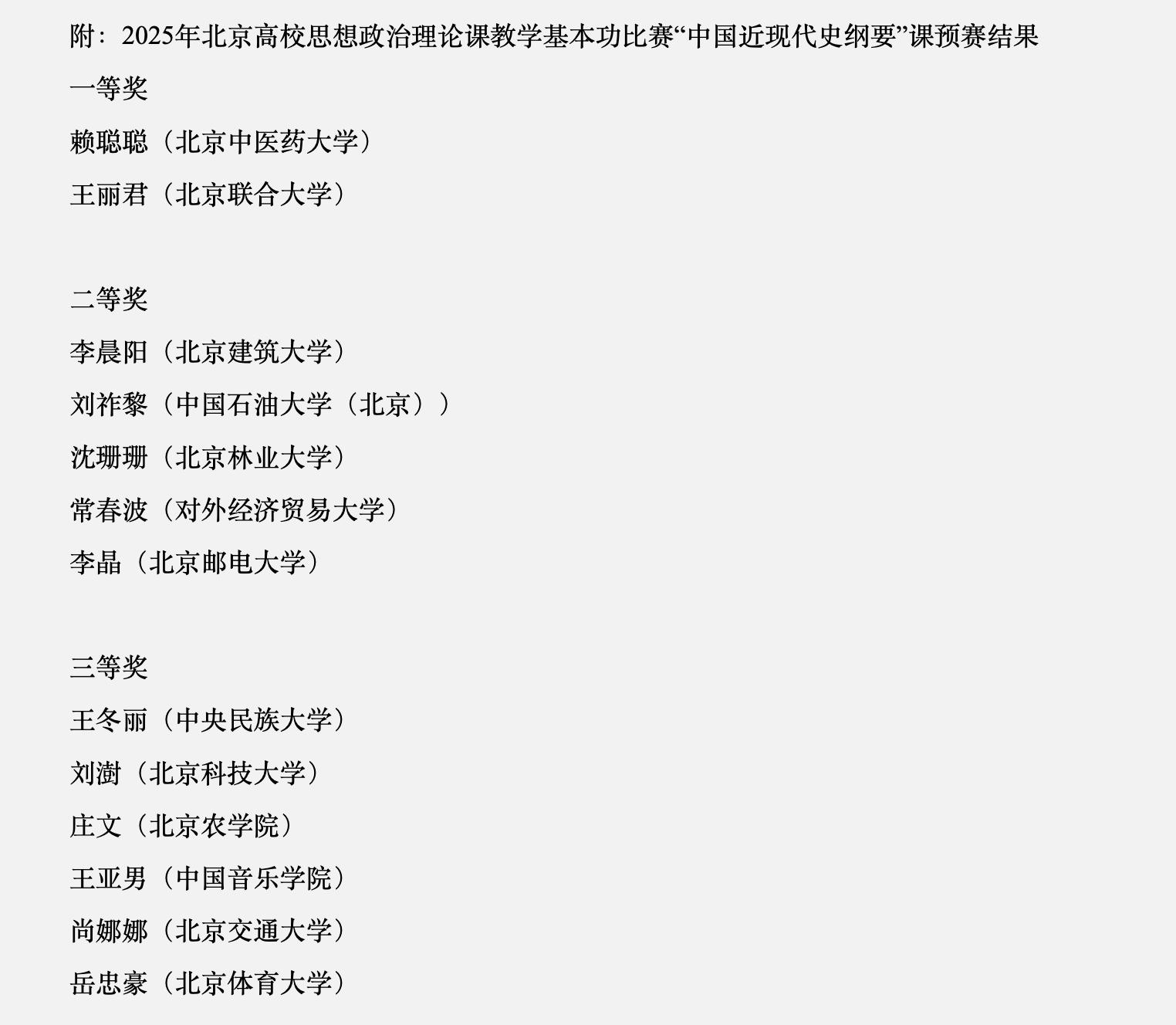 本次比赛吸引了首都高校众多思政课教师参加,竞争激烈。我校四位获奖教师对应课程组别分别是:朱丽雅老师《习近平新时代中国特色社会主义思想概论》、许颖老师《思想道德与法治》、魏爽老师《马克思主义基本原理》、庄文老师《中国近现代史纲要》。他们的获奖充分体现了其个人过硬的教学素养与育人能力。