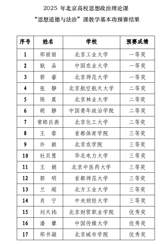 近日,在北京高校思想政治理论课青年教师教学基本功比赛中,我院选派的朱丽雅、许颖、魏爽、庄文四位思想政治理论课青年教师,凭借扎实的理论功底、精湛的教学技艺和出色的现场发挥,分别荣获所在课程组别的三等奖。