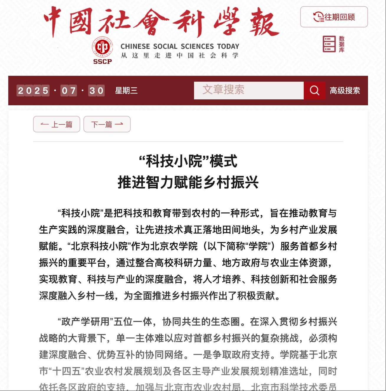 我院教师许颖撰写的文章《“科技小院”模式推进智力赋能乡村振兴》在中国社会科学报发表。文章指出,“科技小院”模式是一种通过整合高校科研力量、政府资源与农业主体需求,推动智力资源下沉乡村的实践路径。它以“政产学研用”五位一体协同机制为基础:政府提供政策与资源支持,依托北京市农业农村发展规划精准选址;产业需求导向确保科研与生产“零偏差”,聚焦绿色生产、智能装备等技术攻关;高校发挥主体作用,组织导师团队长期驻扎;科研精准对接建立试验基地进行技术验证;用户通过“积分制”参与乡村治理,提升内生动力。