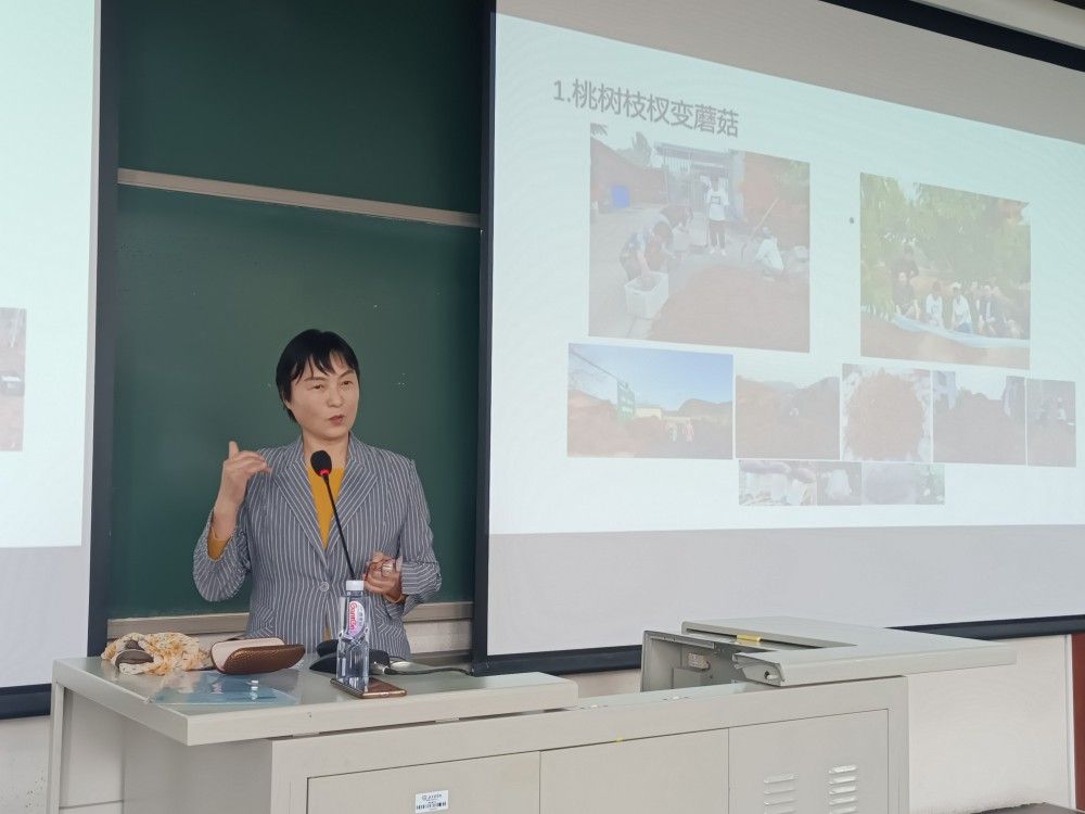 报告中,陈青君结合食用菌创新团队、师生教学科研实成果,以桃树枝杈变蘑菇、黍草麦草点“草”成“金”、林地蘑菇技术的支撑者等内容,讲述了把科研成果转化为科技服务,带动农民致富;将产业发展难题转化为科研动力,推动产业发展,在乡村振兴中发挥的积极作用。报告中,陈青君指出兴趣是最好的老师,她结合学校奋斗在乡村振兴一线的师生事迹,激励同学们走进农业,通过社会实践、科普教学、志愿服务、学科竞赛等活动,在活动中思农爱农,进一步提升青年学生“一懂两爱”品行、情怀,提高服务乡村振兴、农业强国能力。