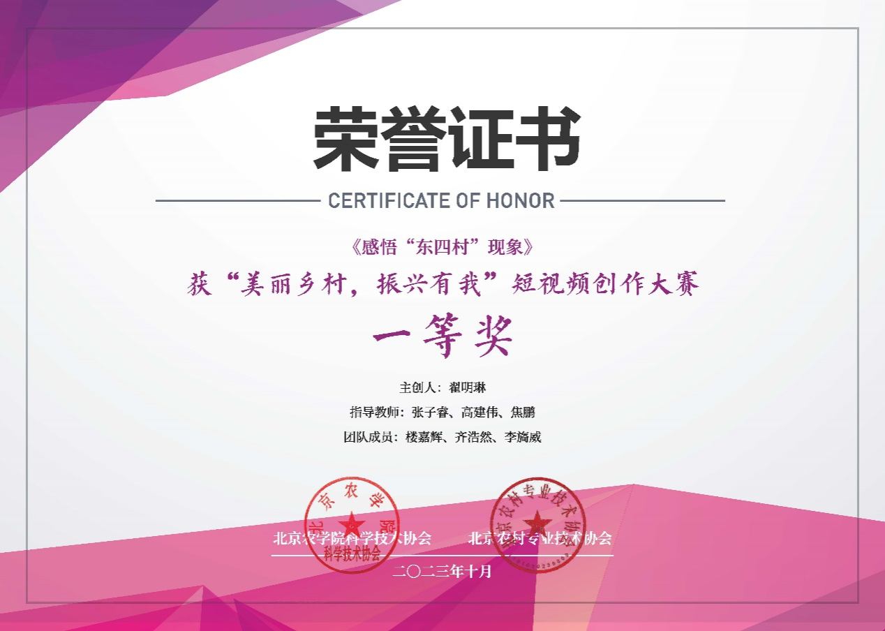 “美丽乡村 振兴有我”短视频创作大赛获奖证书