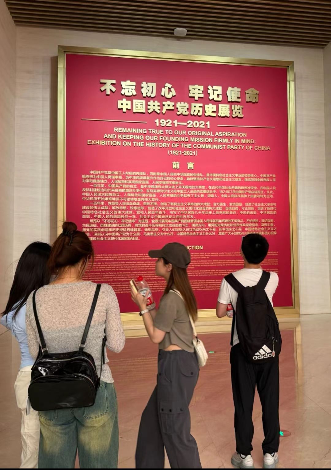 中国共产党历史展览馆按照中国人民站起来、富起来、强起来的历史脉络,全方位、全过程、全景式展现中国共产党波澜壮阔的百年奋斗历程。在实践活动中,同学们参观了中国共产党历史展览馆的各个展厅。展览馆通过两千余幅图片、四千多件套文物实物,以及珍贵的档案资料、生动的图片视频和逼真的复原景观,生动再现了党的历史,从建立中国共产党夺取新民主主义革命伟大胜利、成立中华人民共和国进行社会主义革命和建设、实行改革开放开创和发展中国特色社会主义,到推进中国特色社会主义进入新时代,全面建成小康社会,开启全面建设社会主义现代化国家新征程。同学们通过参观,回顾了马克思主义中国化时代化的伟大历程,深刻感悟到中国共产党为中国人民谋幸福、为中华民族谋复兴的初心和使命,以及为之不懈奋斗的伟大建党精神,进一步坚定了对中国特色社会主义的“四个自信”。