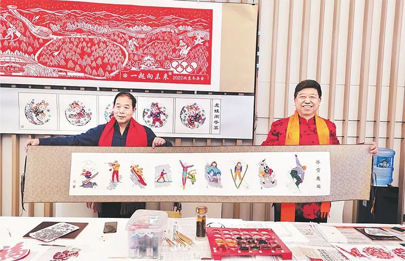 图为来自河北省张家口市蔚县的省级非遗传承人高佃亮(右)展示冬奥题材蔚县剪纸作品。 河北日报社供图