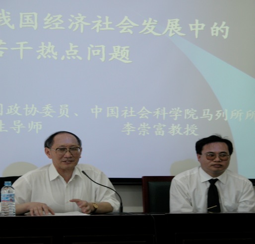 2008年4月2日下午,全国政协委员、中国社会科学院学部委员李崇富教授应邀来我校就当前经济社会发展中的热点问题作报告。参加报告会的有人文社科系思想政治理论教研室全体教师、系学术委员会成员、教研室主任、党支部书记和部分学生党员。李教授先简要介绍了全国政协的三项职能和两大主题以及本次“两会”的基本情况,然后就政府机构改革、民生问题、农业的基础地位等热点问题作了较详细的讲解和分析,并介绍了自己去年和今年向全国政协提交的两个提案。之后,一些教师就一些热点问题和李教授作了交流。李教授的讲解深入浅出,深受师生们欢迎,大家普遍反映受益匪浅。