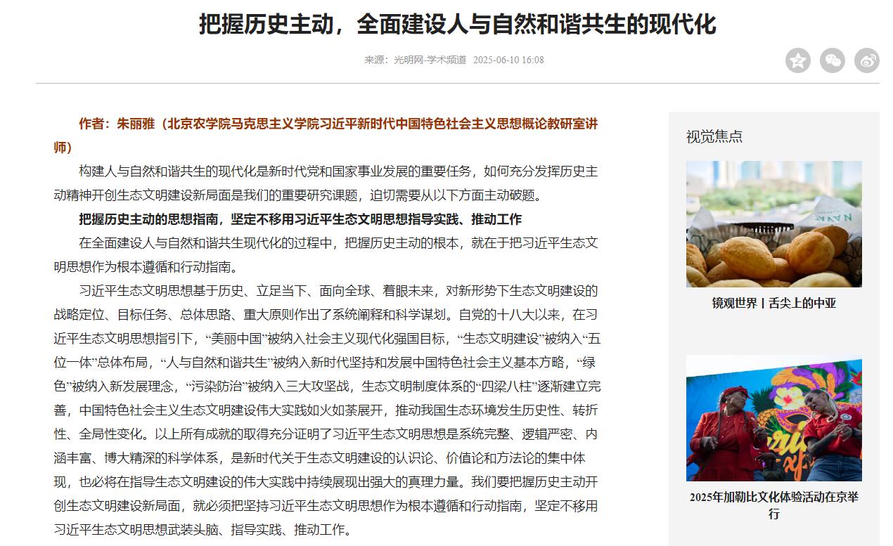 近日,光明网学术频道刊登我院教师朱丽雅文章《把握历史主动,全面建设人与自然和谐共生的现代化》。该文立足构建人与自然和谐共生的现代化,聚焦思想指南、价值导向、问题导向、战略路径、国际潮流五个维度,思考阐述了如何充分发挥历史主动精神以开创生态文明建设新局面。