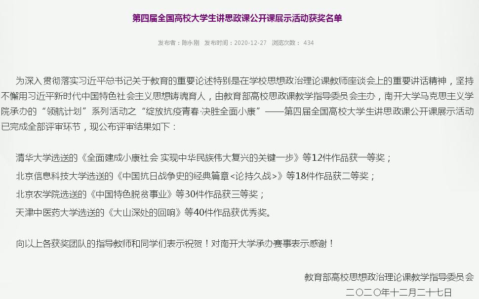 12月27日,由教育部高等学校思想政治理论课教学指导委员会主办,南开大学williamhill英国承办的“绽放抗疫青春,决胜全面小康”——第四届全国高校大学生讲思政课公开课展示活动总决赛落下帷幕。