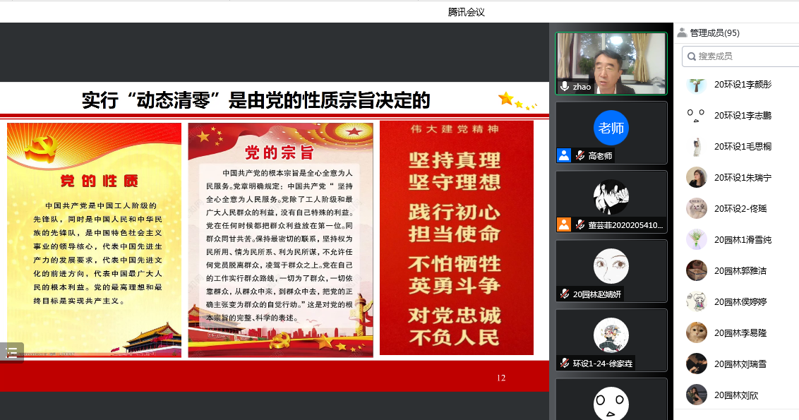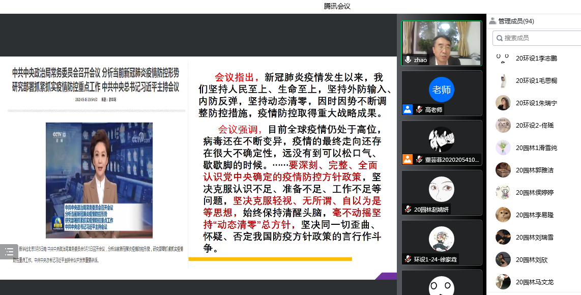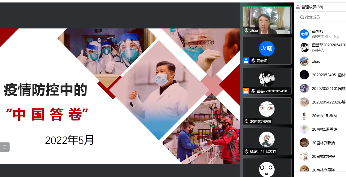 “请同学们认真思考通过中外防疫比较,我们国家的制度优势体现在哪里?请同学们结合实际谈一谈什么我国为什么要实行‘动态清零’方针?”这是在最近一次大学生思政课上,校党委书记赵锋为同学们布置的课后思考题。为了教育引导广大学生正确认识当前疫情形势和我国实行“动态清零”方针的必要性、重要性。5月7日晚,英国威廉公司党委书记赵锋进入思政课堂,为园林学院2020级环境设计专业和园林专业本科生讲授“疫情防控中的中国答卷”思政课。
