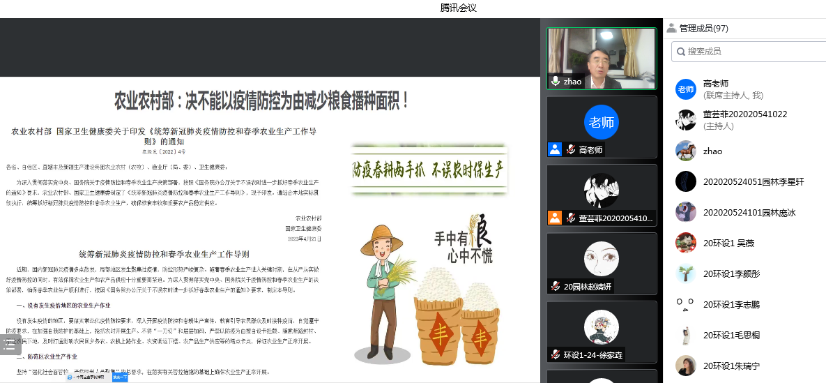 赵锋讲到,以习近平同志为核心的党中央的坚强领导、中国特色社会主义制度的显著优势、改革开放以来积累的雄厚物质技术基础,为我们从严从实抓好疫情防控工作并最终战胜疫情,提供了根本保证和强大支撑。既要从严从实抓好疫情防控,又要统筹疫情防控与经济社会发展。结合农业院校特色,赵锋给同学们解读了最近农业农村部、国家卫生健康委联合印发《统筹新冠肺炎疫情防控和春季农业生产工作导则》,强调了“中国人的饭碗任何时候都要牢牢端在自己手上,我们的饭碗应该主要装中国粮”这一重要论断的深刻内涵和重要意义。
