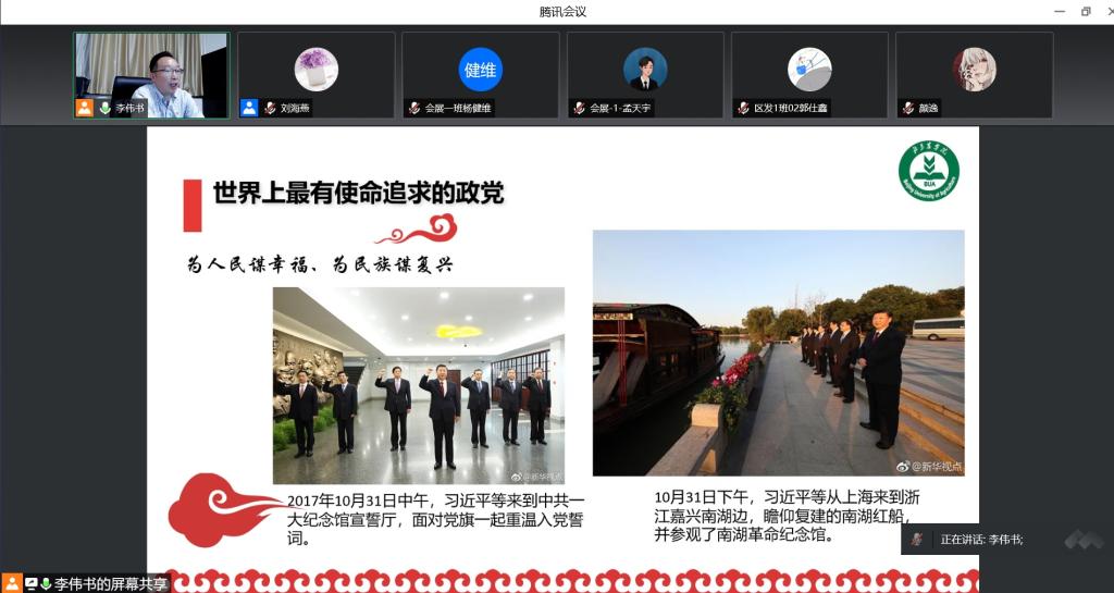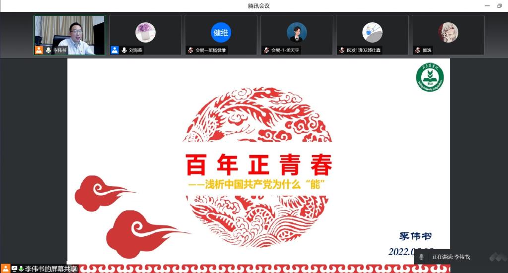 5月5日晚,学校纪委书记李伟书给文发学院20级农村区域发展、会展经济与管理专业110余名学生讲授了题为“百年正青春——浅析中国共产党为什么能”的形势与政策课。
