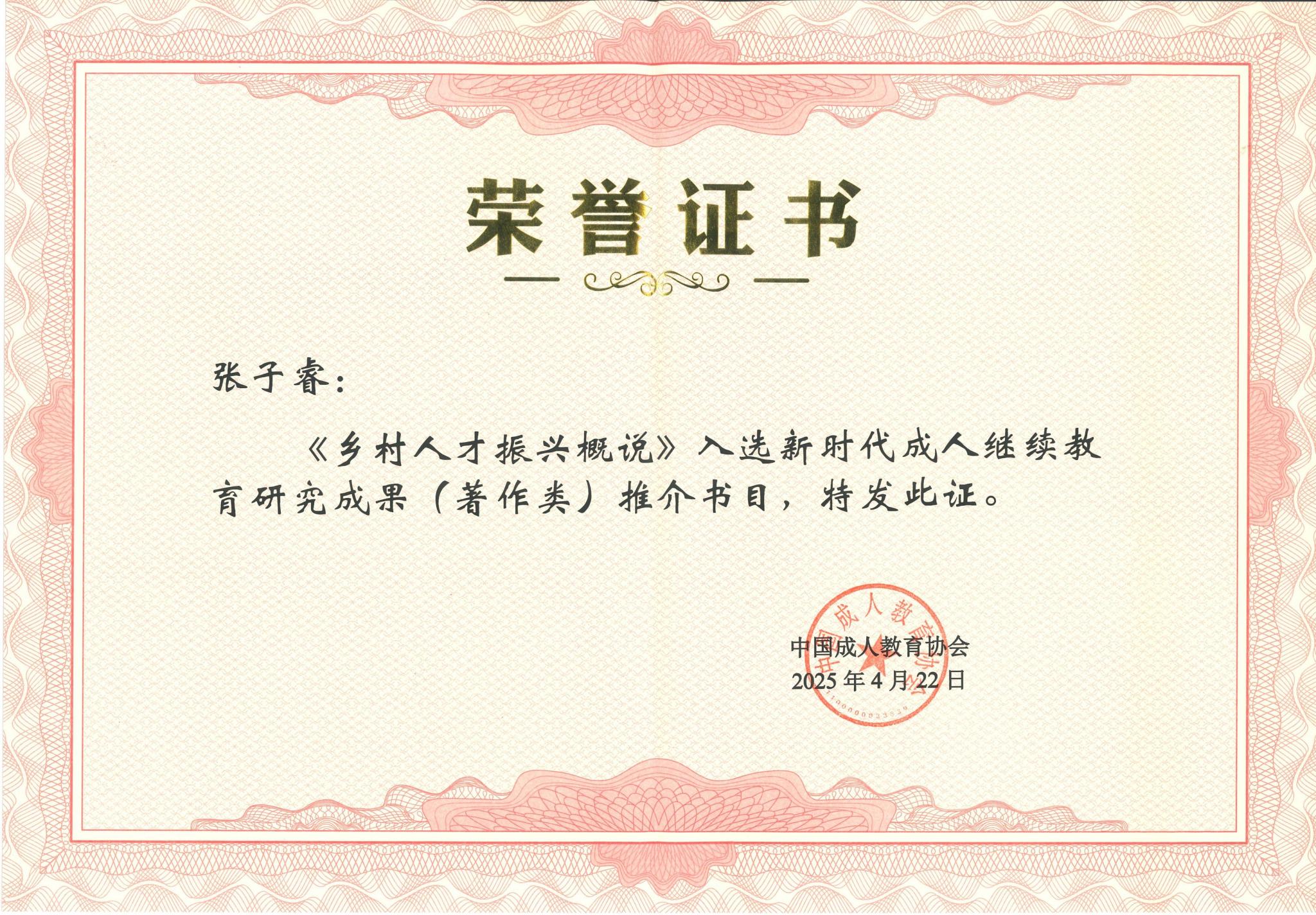 为全面贯彻党的二十大精神,认真落实建设全民终身学习的学习型社会、学习型大国的要求,中国成人教育协会和北京市成人教育学会相继发布了《关于征集新时代成人继续教育学术专著的通知》,继续教育学院根据通知要求积极开展优秀成果的征集和上报工作。经中国成人教育协会专家组审定,我校张子睿老师编著的《乡村人才振兴概说》入选新时代成人继续教育研究成果(著作类)推介书目。