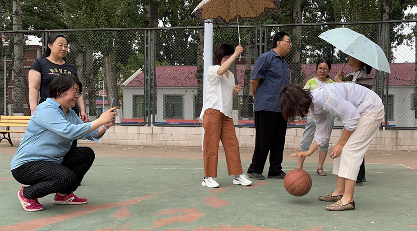 虽然雨中进行活动,但大家都很乐观,夏日难得凉爽天气,丝丝细雨又平添几分兴致与诗意。长走之后,教师们又进行了定点投篮、篮球拍球、手颠乒乓球等趣味竞赛活动。
